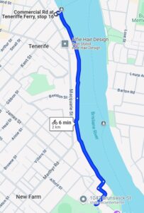 Salida desde la Rotonda de New Farm Park, cruce hacia la Powerhouse y trayecto de ida hasta la parada de ferry de Teneriffe, regreso por el mismo camino.